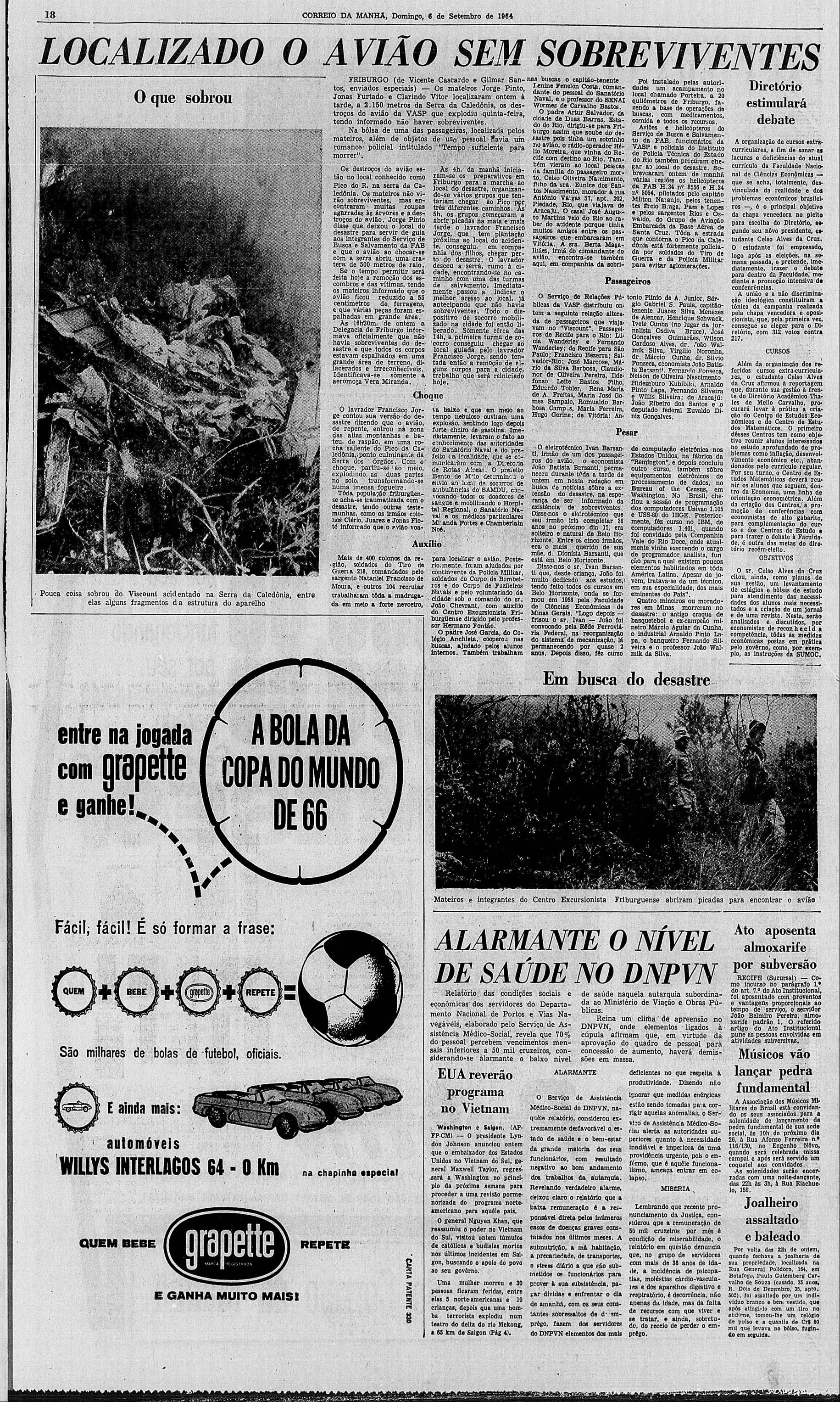 O segundo acidente ocorreu em 4 de setembro de 1964. O avião Vickeris Viscounti 701C, matrícula PPSSR, da VASP decolou em uma sexta-feira, de Vitória rumo ao Rio de Janeiro. O avião havia se afastado da rota planejada sem o conhecimento da tripulação estando próximo a Nova Friburgo. Por volta das 19h colidiu contra a face leste da Pedra do Caledônia morrendo 5 tripulantes e 34 passageiros. Na manhã seguinte, moradores do terceiro distrito se dirigiram ao local do acidente pilhando quantias em dinheiro, joias, relógios, entre outros objetos de valor. A cena que encontraram foi de pedaços de corpos e vísceras espalhadas no local do acidente. Porém, mesmo diante do impacto da cena não se intimidaram em cortar dedos e braços inchados para levar consigo objetos de valor. Foi encontrado muito dinheiro, pois naquela época não se fazia muito o uso de cartão de crédito como nos dias atuais. Até mesmo brincadeira de mal gosto ocorreu entre os saqueadores. Um homem embrulhou o pênis de uma das vítimas em uma camisa e deu a uma mulher que pilhava entre os escombros dizendo que o objeto talvez lhe fosse útil.