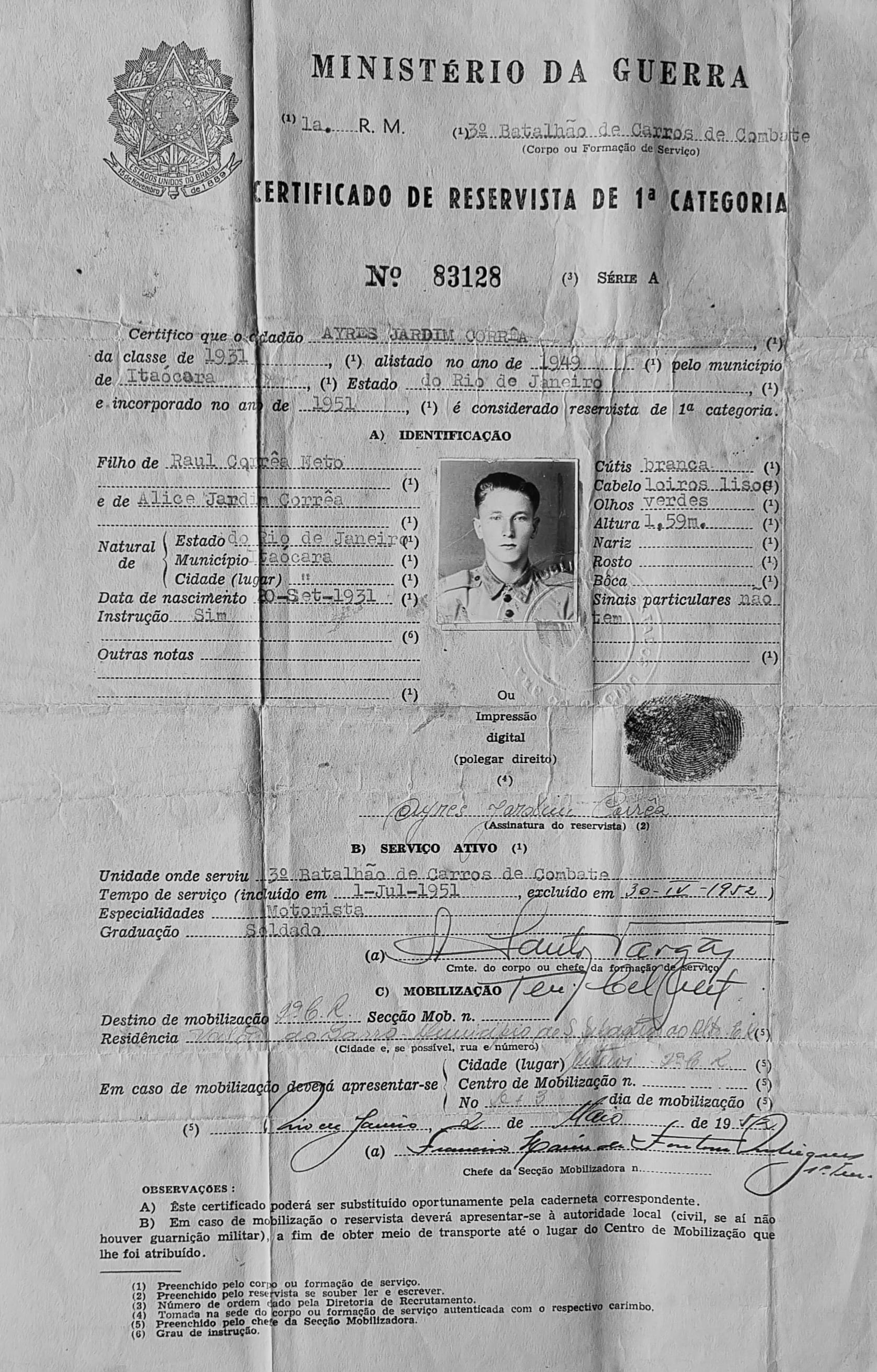 No entanto, estranhei que o meu pai, Ayres Jardim Corrêa, nascido em 20 de setembro de 1931, em Itaocara(RJ), assim como seu contemporâneo, o friburguense Vanderley Schwenck tenham se deslocado para o Rio de Janeiro para prestar o serviço militar. Jardim Corrêa era comerciante e Schwenck agricultor, ambos arrimo de família. Em razão de seu trabalho, meu pai tentou se livrar do serviço militar apresentando uma declaração, solicitada ao delegado de polícia Dalmo Freire Barreto, de que era comerciante no local denominado Fazenda da Boa Vista, em Itaocara. Mas não logrou êxito. Foi convocado e serviu como soldado no período de 01 de julho de 1951 a 30 de abril de 1952, no 3° Batalhão de Carros de Combate no Rio de Janeiro.