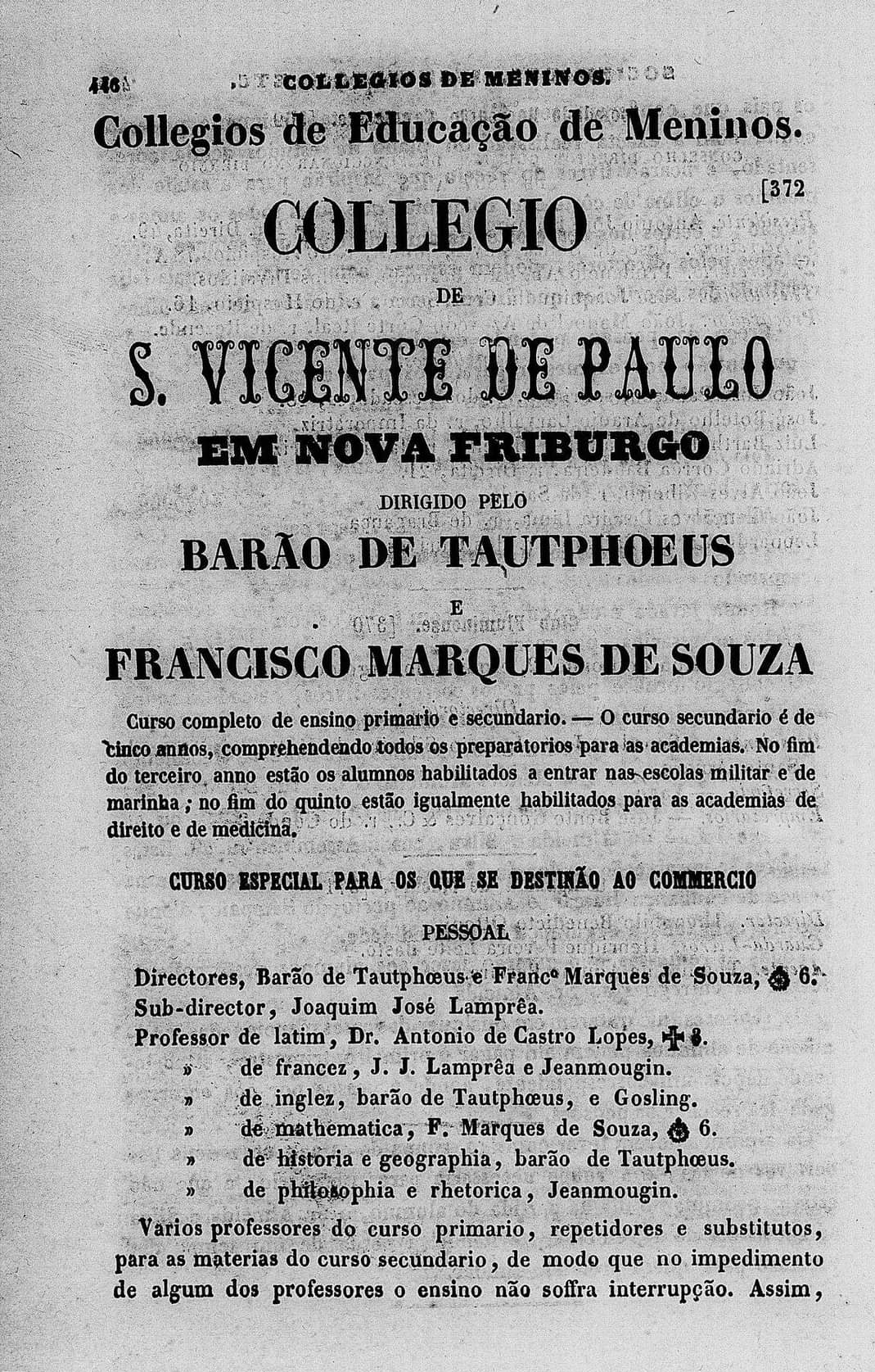 “O colégio de São Vicente de Paula, vantajosamente conhecido por ter dado sempre bons alunos nos exames públicos, e que pelos seus esforços do seu digno diretor o Sr. Marques se acha em um florescente estado, vai ganhar com esta aquisição dobrado valor. Na verdade, o colégio do sr. Barão de Tautphoeus, um dos primeiros da Corte e o único que apresenta, como li nos jornais, o mais brilhante resultado nos exames feitos perante o conselho de instrução pública, resultado não conseguido até a agora por colégio algum; o seu diretor o sr. Barão de Tautphoeus, cuja vasta ilustração é por todos reconhecida, (...) Tudo isto me faz crer que em Nova Friburgo acharão os pais de família uma garantia segura na prosperidade na educação literária de seus filhos, reunida às importantes condições de salubridade, pois ninguém ignora quão salubre e ameno é o clima deste município. Ambos estes estabelecimentos, fundidos em um só com a denominação de colégio de São Vicente de Paula promete à mocidade indubitáveis vantagens, e ainda mais a facilidade de proporcionar aos habitantes de Cantagalo, Itaboraí, Porto das Caixas, e aos de todas as circunvizinhanças de Nova Friburgo os meios de educar seus filhos, sem temor das epidemias de que é quase sempre vítima a Corte. Felicito ao Sr. Marques, como meu conterrâneo, e ao sr. Barão de Tautphoeus pela ideia que tiveram de reunirem suas forças literárias e por haverem escolhido tão acertadamente como lugar de seu estabelecimento a vila de Nova Friburgo. Um Cantagalense.” Correio Mercantil, 19 de janeiro de 1858.