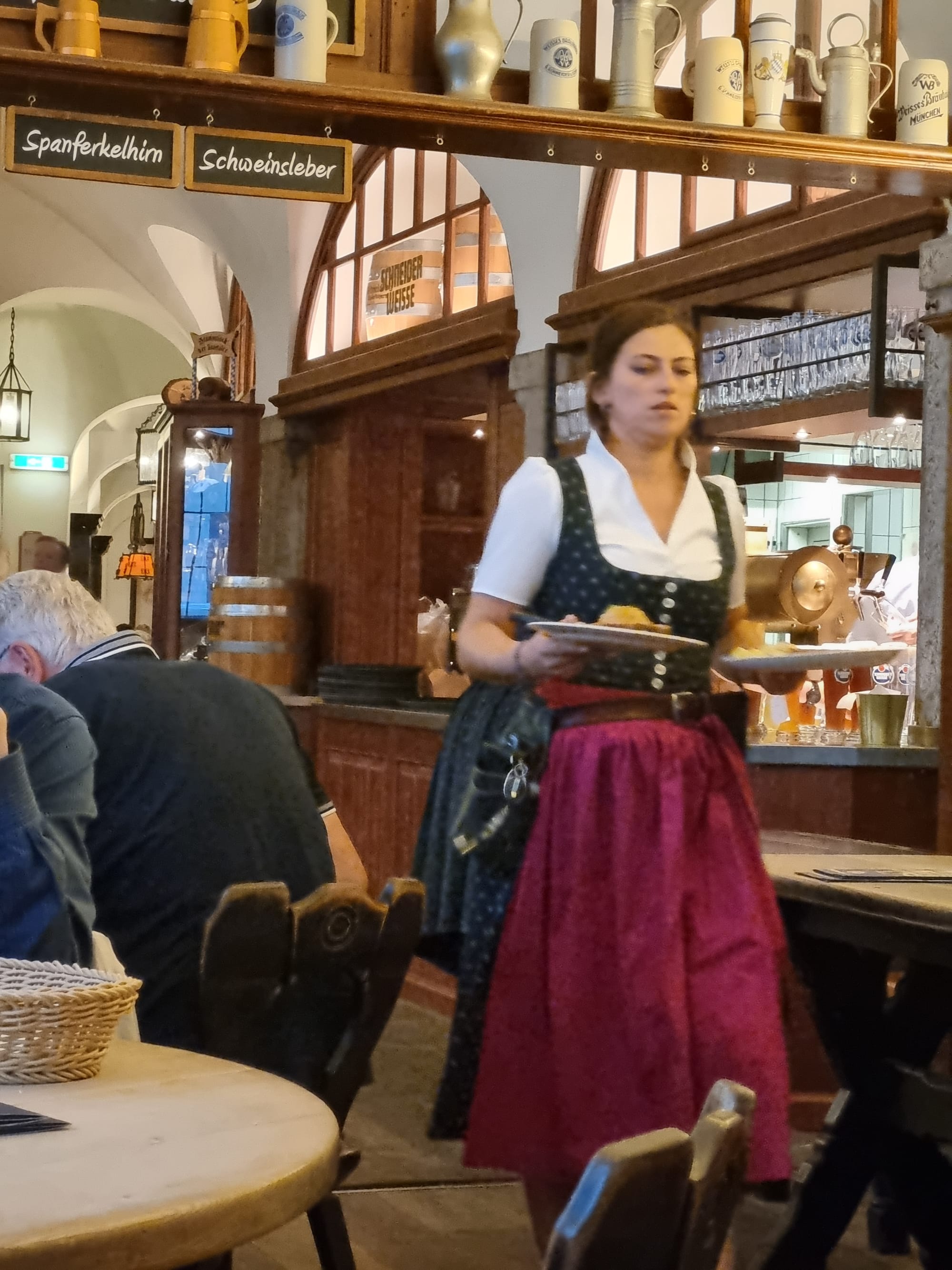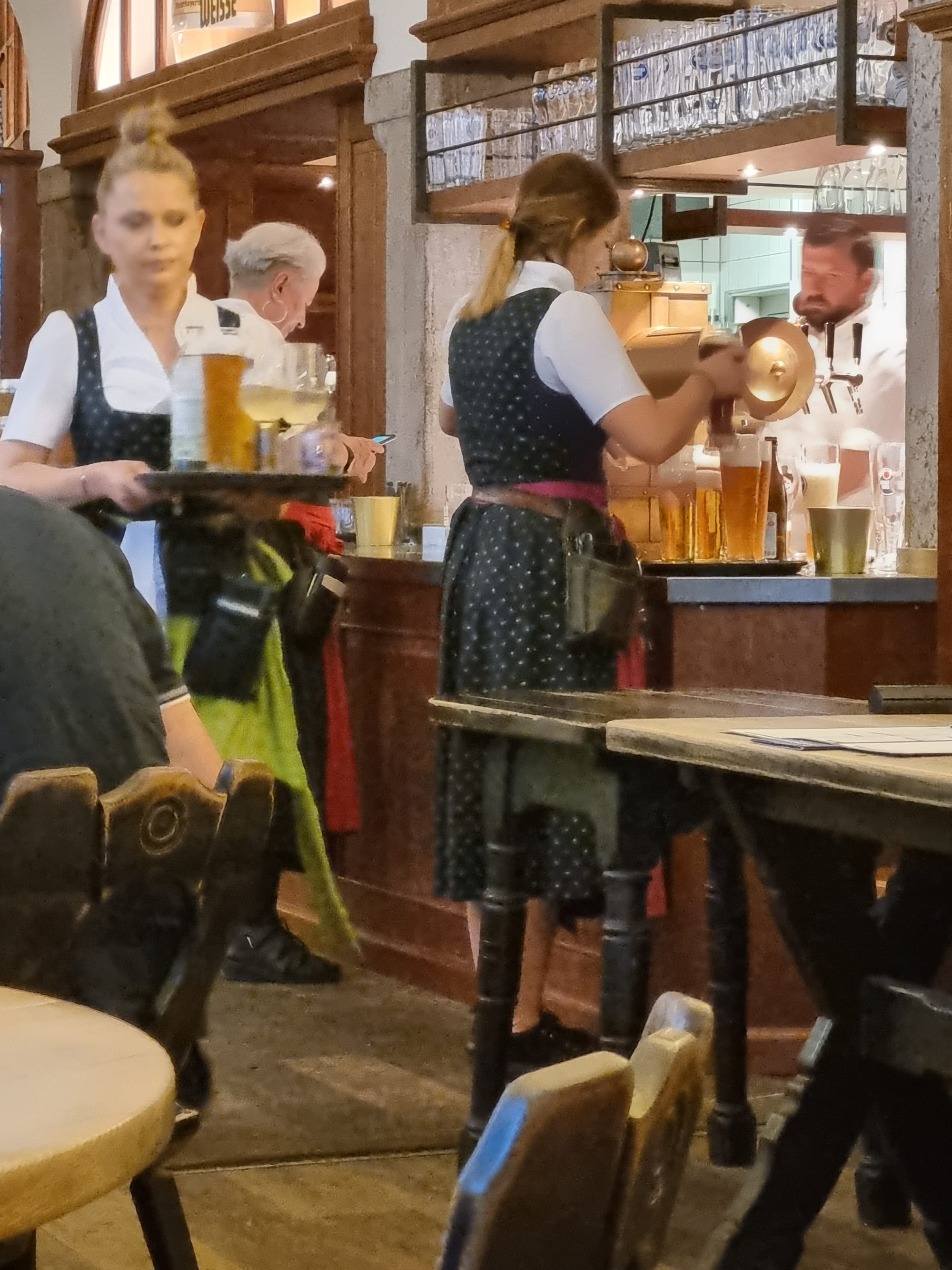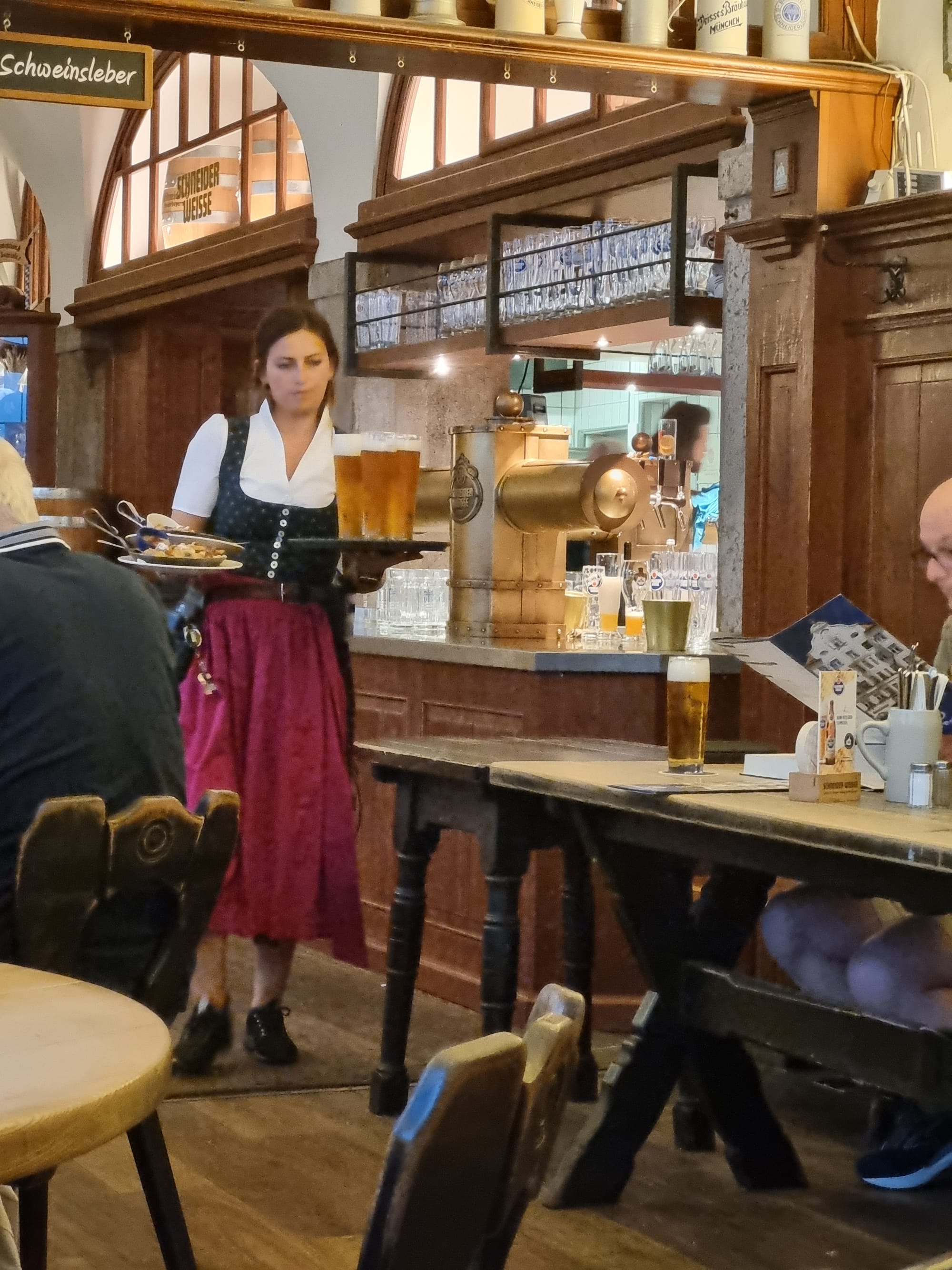 Nas cervejarias as mesas são extensas e divididas com estranhos. Pode-se estar sentado em uma delas e o garçom direcionar pessoas para compartilharem a nossa mesa. Tanto os atendentes homens quanto as mulheres vestem um traje típico nas cervejarias e é muito comum encontrar senhores muito idosos, sozinhos, alguns com traje típico, passando longas horas na cervejaria consumindo cerveja com moderação.