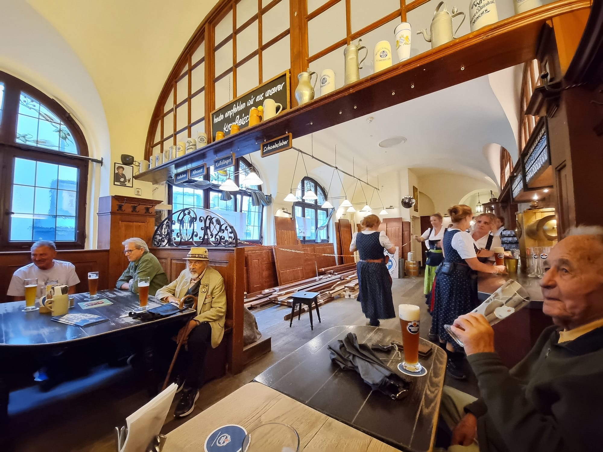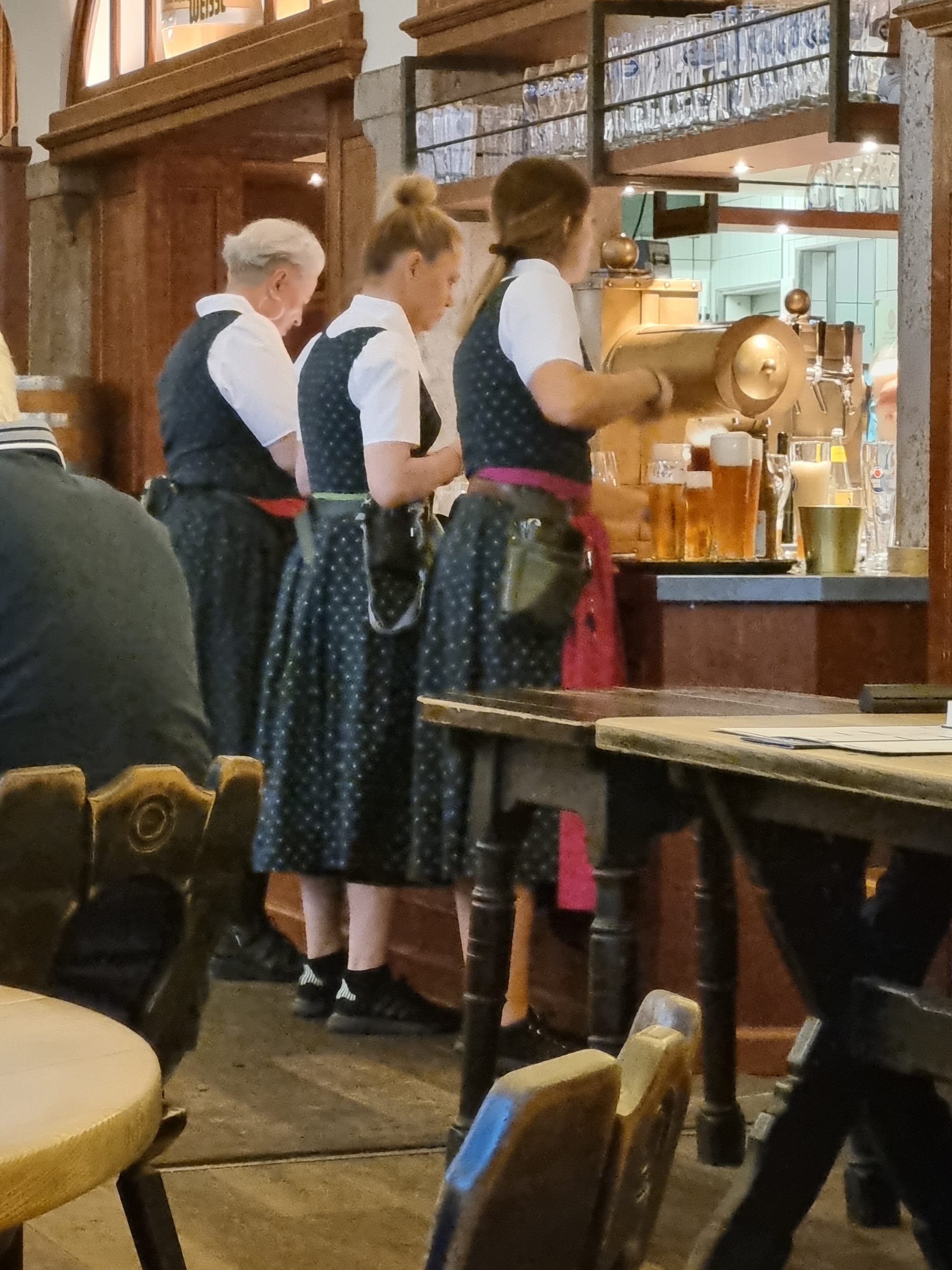 Nas cervejarias as mesas são extensas e divididas com estranhos. Pode-se estar sentado em uma delas e o garçom direcionar pessoas para compartilharem a nossa mesa. Tanto os atendentes homens quanto as mulheres vestem um traje típico nas cervejarias e é muito comum encontrar senhores muito idosos, sozinhos, alguns com traje típico, passando longas horas na cervejaria consumindo cerveja com moderação. Observa-se que as cervejarias funcionam como um ambiente predominantemente de sociabilidade masculina. Pude notar a presença de diversos grupos compostos exclusivamente por homens, que se reuniam sem suas companheiras – namoradas ou esposas – para beber cerveja e conversar. Apesar de oferecerem um espaço externo aos clientes, é o ambiente interno desses estabelecimentos que se revela mais interessante.