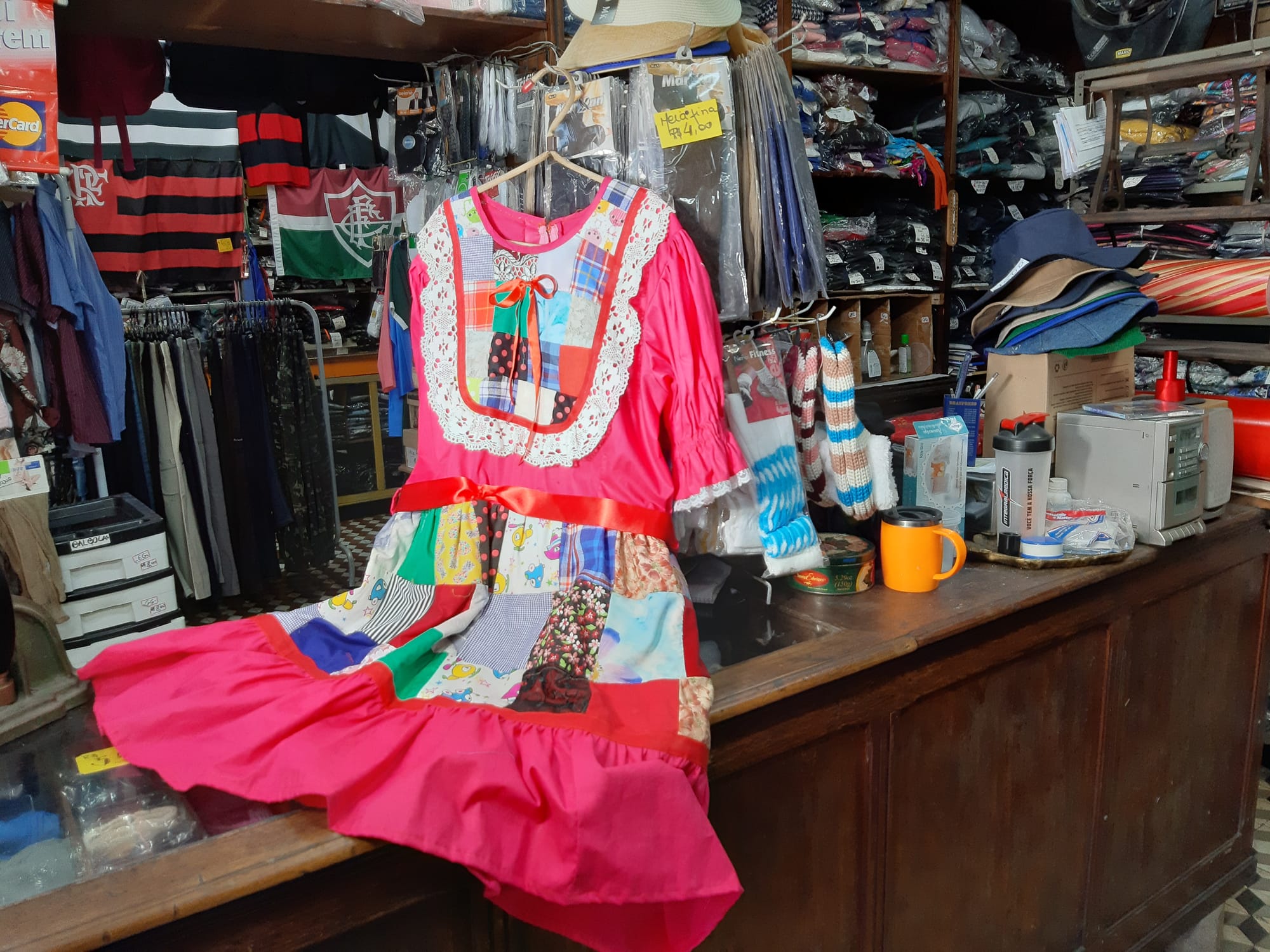 Eliane Abicalil e na foto ao lado, o vestido de festa junina feito por Dona Nair Abicalil. Acervo pessoal