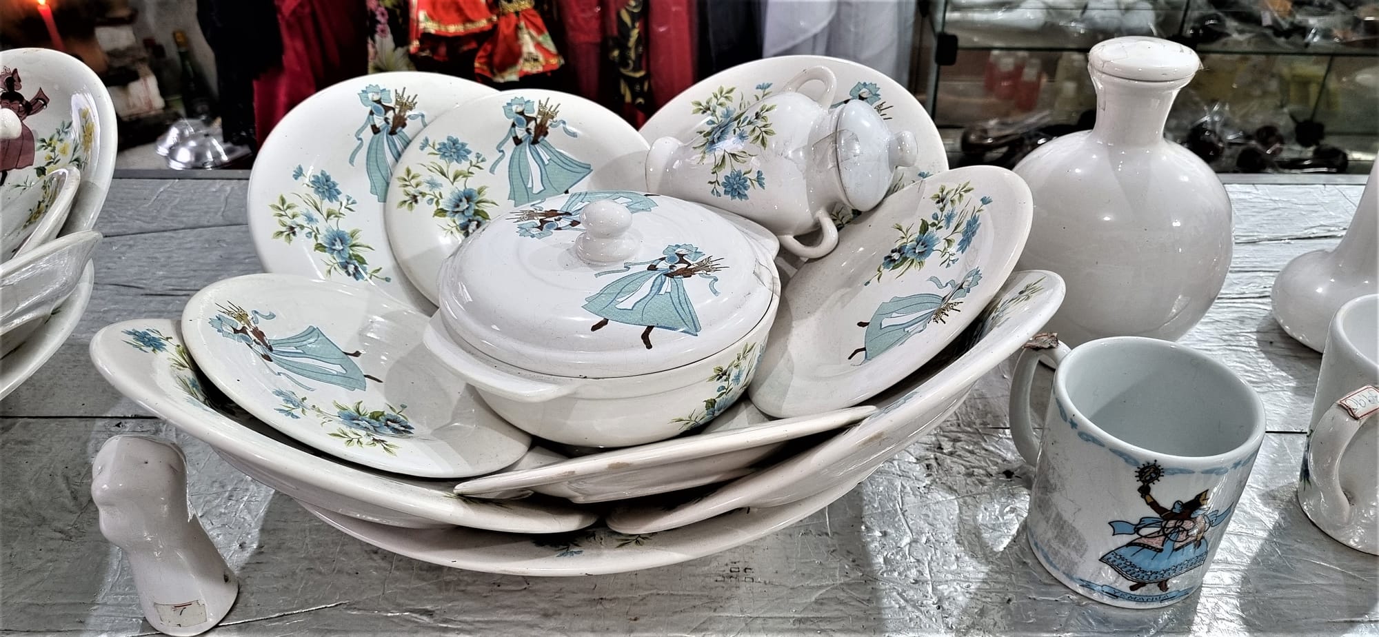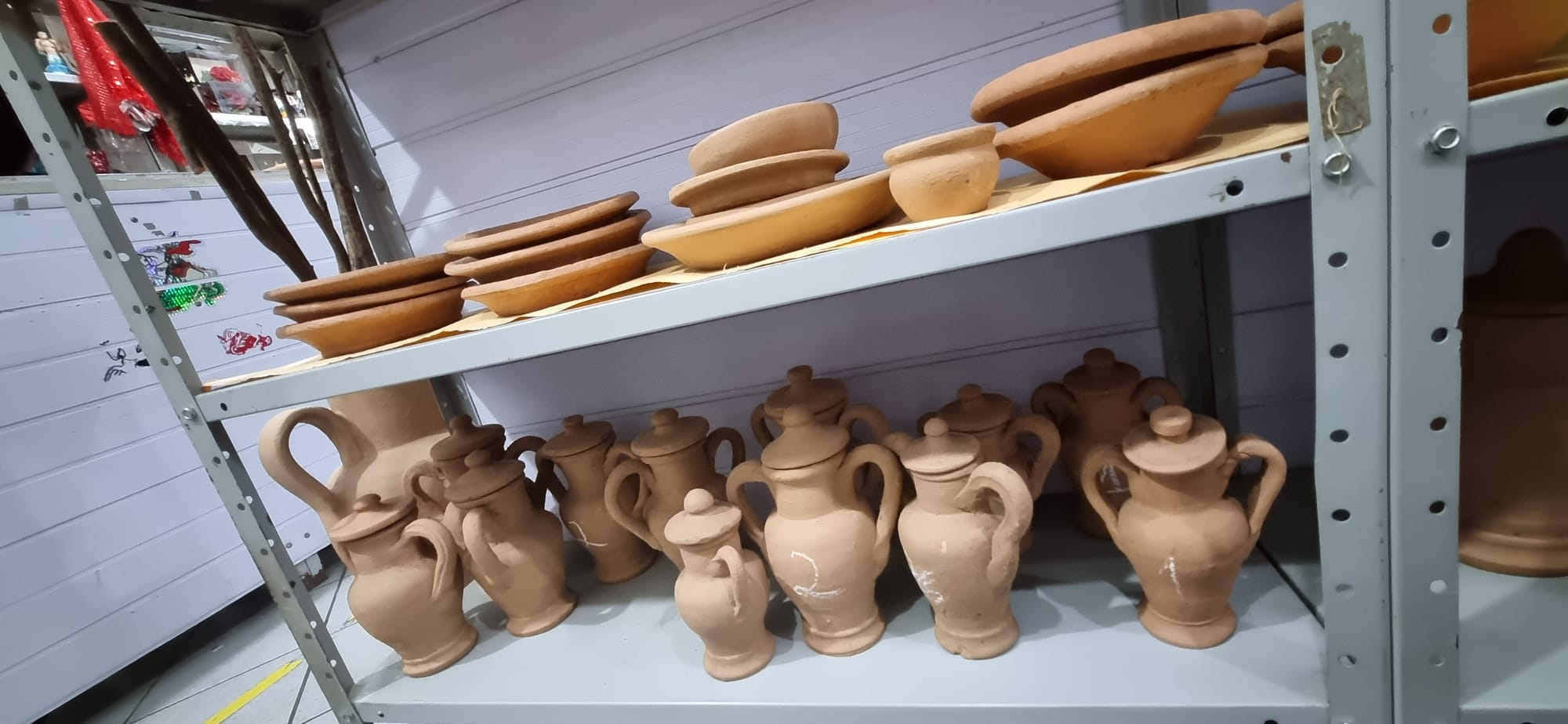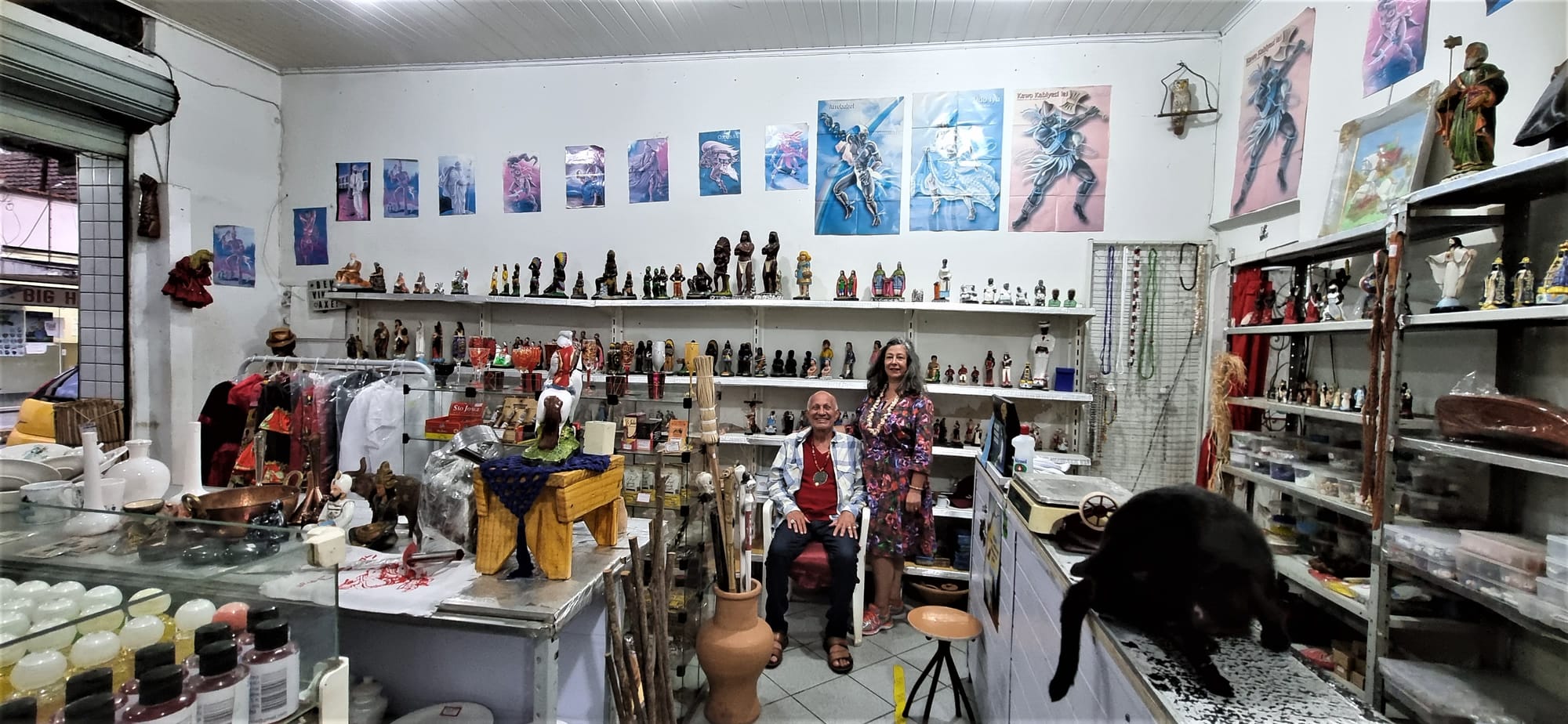 É imensa a variedade de itens na loja e Pai Amaro de Xangô me explicou os que despertaram a minha curiosidade. Inicialmente perguntei sobre a venda de santos católicos e ele respondeu que são comprados pelos umbandistas, pois nesta religião São Jorge é Ogum, Nossa Senhora da Conceição é Oxum e São João Batista Xangô. Chamaram a minha atenção pequenos jarros de cerâmica. São para as oferendas. O jarro que tem duas asas é oferenda para um Orixá feminino, como Oxum. Logo, o jarro sem asas é para um Orixá masculino. Os colares de miçangas são guias e cada um corresponde a um Orixá, sendo igualmente mandalas de proteção. Existe na loja um conjunto de louças de inúmeras peças com estampas de cores variadas, assim como de peças todas brancas. São usadas na iniciação do Iaô no candomblé. De acordo com a ancestralidade pode ser para Iemanjá, Iansã etc. A de peça branca é oferenda quando a ancestralidade é Oxalá.