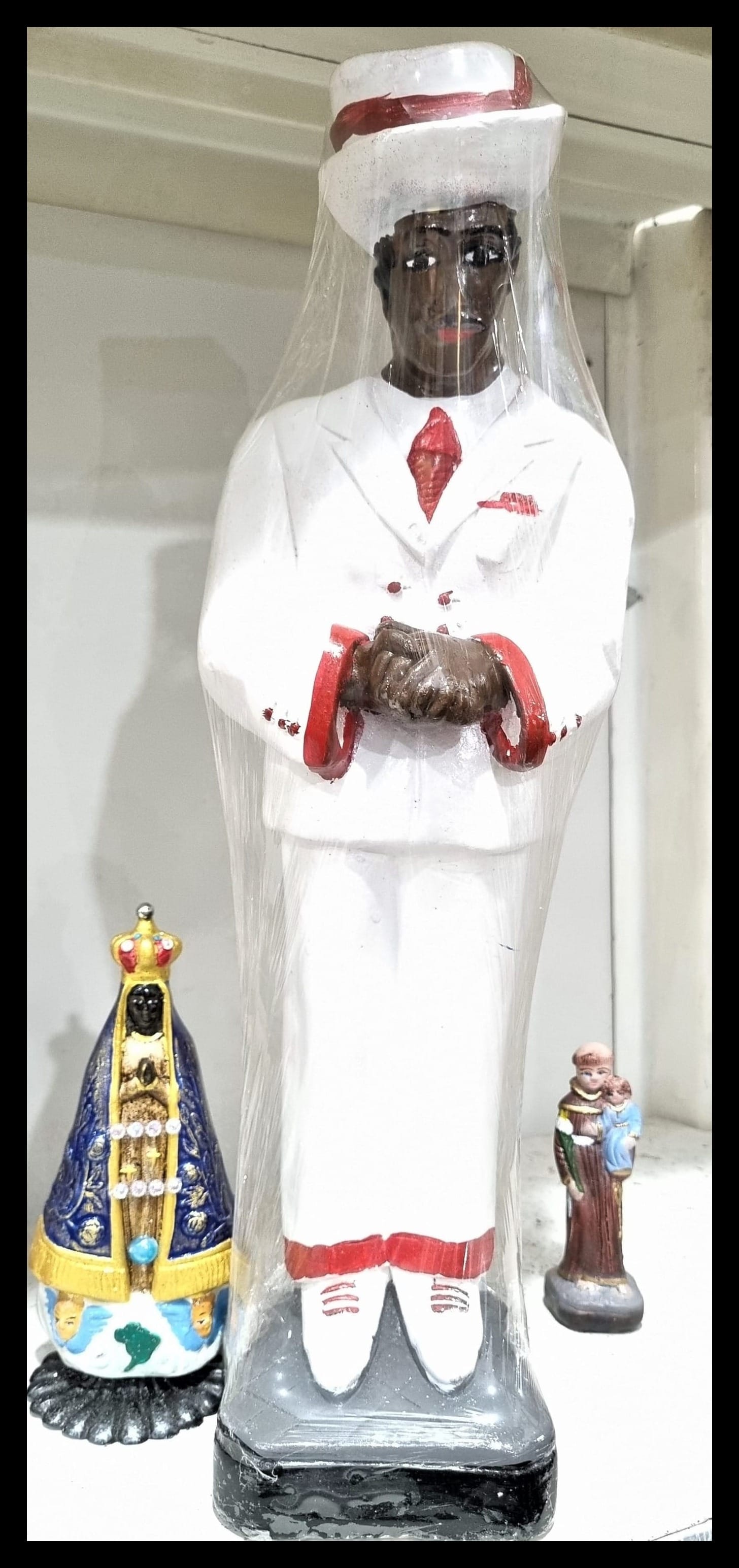 Minha curiosidade foi imensa em relação a estátua de um homem elegante, uma espécie de dândi. Trata-se do Zé Pilintra, uma entidade de luz originária do Catimbó, surgido no Nordeste do Brasil. É representado trajando terno de linho na cor branca, sapatos bicolor, gravata vermelha e chapéu panamá de fita vermelha ou preta, parecendo o típico malandro carioca. O Zé Pilintra tem importância para os praticantes de umbanda, comumente incorporado em terreiros. Indaguei sobre as imagens de indígenas., assim como os umbandistas. Não existe o diabo em nenhuma destas crenças, mas tão somente o “babaegum”, espírito que não recebeu a luz e fica infernizando a vida de algumas pessoas.