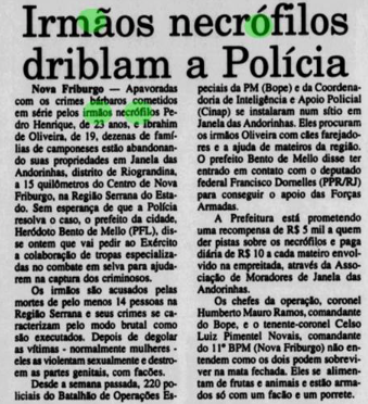 Os homicídios em série cometidos por Ibraim e Henrique Oliveira ocorreram no início da década de 1990 na localidade de Janela das Andorinhas, distrito de Riograndina, área rural do município de Nova Friburgo. A maioria dos lavradores desta região plantam caqui, influência da imigração japonesa. Esta pacata comunidade rural, a mais paupérrima entre os distritos agrícolas de Nova Friburgo, foi cenário de diversos homicídios cometidos com requintes de crueldade pelos irmãos Oliveira, moradores da localidade. A maioria das vítimas eram mulheres. Após os assassinatos Ibraim e Henrique tinham relação sexual com os cadáveres e por isto ganharam a alcunha da mídia de irmãos necrófilos.