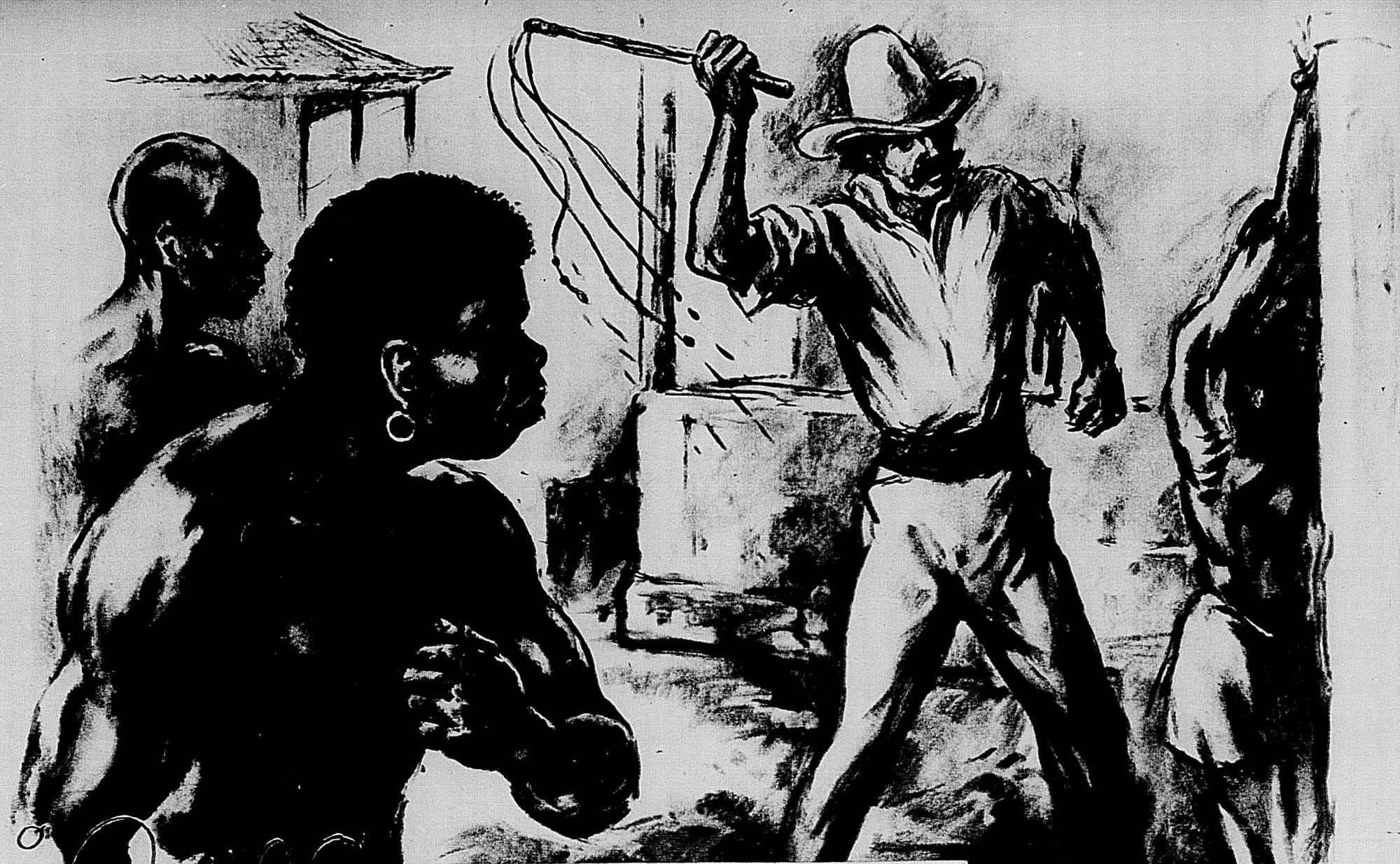 O senhor Antônio Pinto observava o trabalho de uma janela do sobrado com certo orgulho, um prazer satânico que se traduzia num sorriso perverso. Alguns pretos ressabiados espiavam à distância, cheios de medo. Moleques como cães pelas moitas espiavam com olhos medrosos, ariscos. Aquilo era exatamente para que eles vissem o exemplo. A senhora da casa expiou da janela e vendo o estado miserável do pobre diabo sentiu um pouquinho de piedade e gritou – Chega gente! Mas o capataz fingiu não ouvir. Era necessário fazer uma exibição convincente de perversidade e mostrar ao senhor que não tinha pena de negro. Antônio Pinto espalmou a mão direita no ar e disse também. – Chega! O capataz deu ainda três lambadas vigorosas, atirou o bacalhau ao solo e desatou os laços que prendiam o preto velho ao moirão. Este derreou-se como uma pesada massa no terreiro. Perdera os sentidos. O corpo estava encaroçado e cheio de vergões. Pobre velho Tibúrcio! Deixando o terreiro o olhar do capataz se cruza com os olhos frios e taciturno do negro mal encarado que observava o castigo, Carukango!