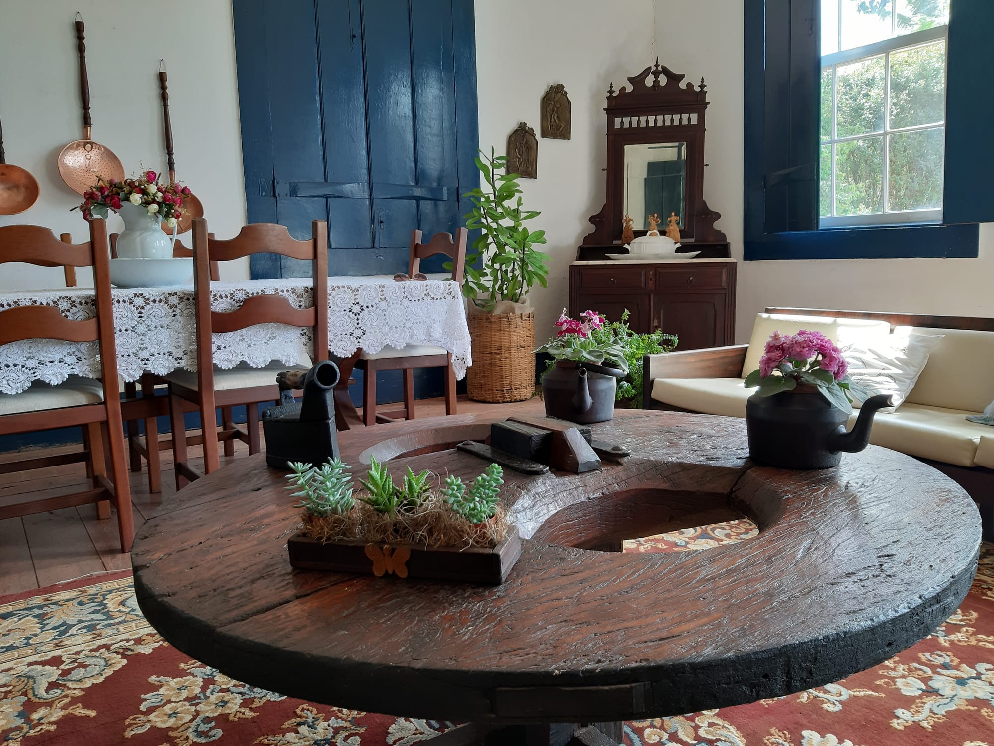 Na decoração dos ambientes sociais da casa-sede, antigos objetos da fazenda viram peças de decoração a exemplo de uma antiga roda de carro boi e um recipiente de madeira para transportar o porco abatido que viram mesa de centro, ganhando esse último um tampo de vidro.