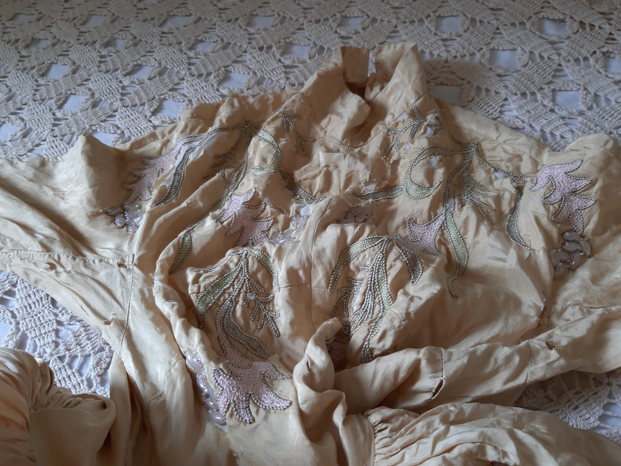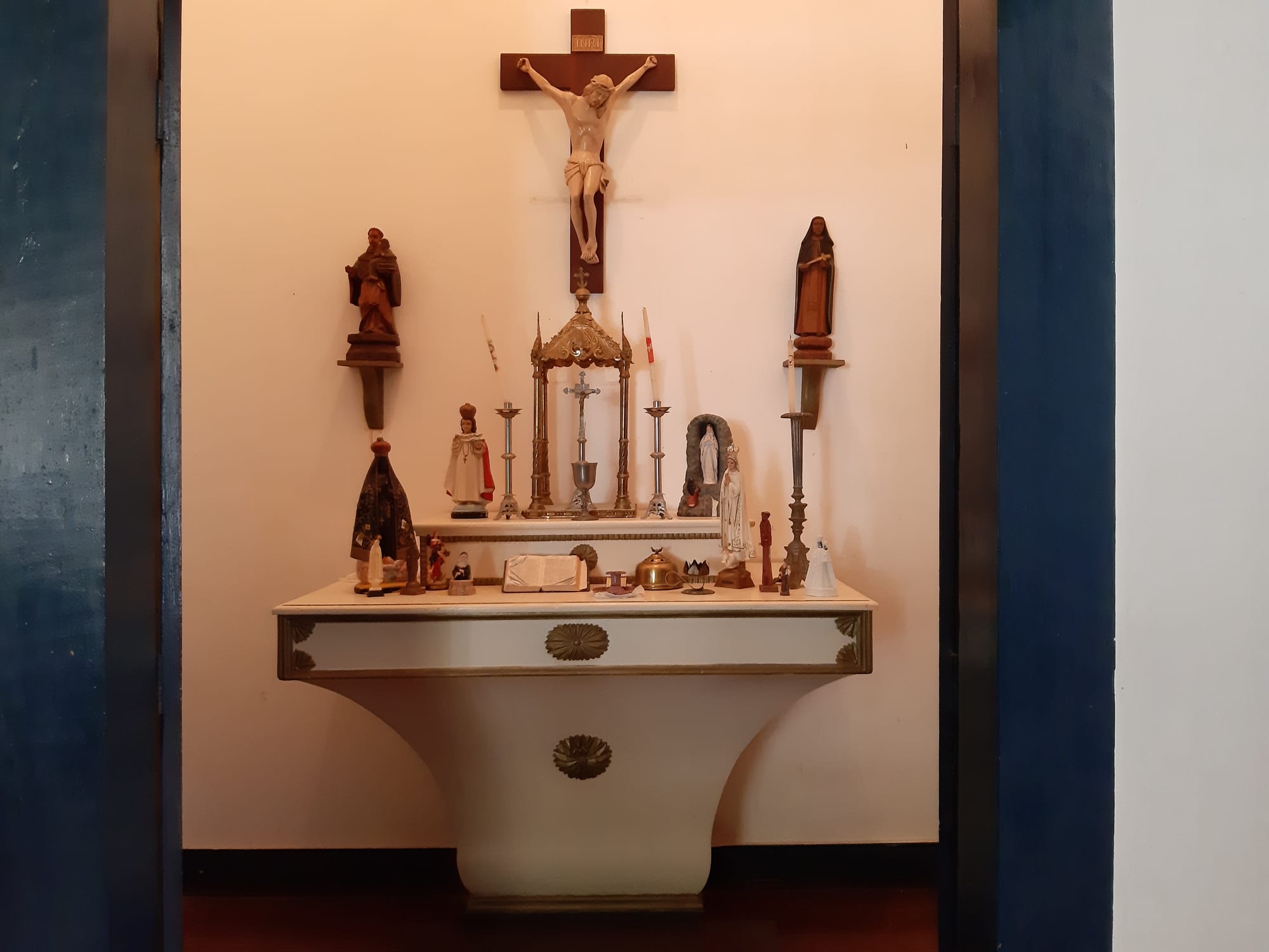 Detalhes do vestido de noiva e o oratório ao lado.